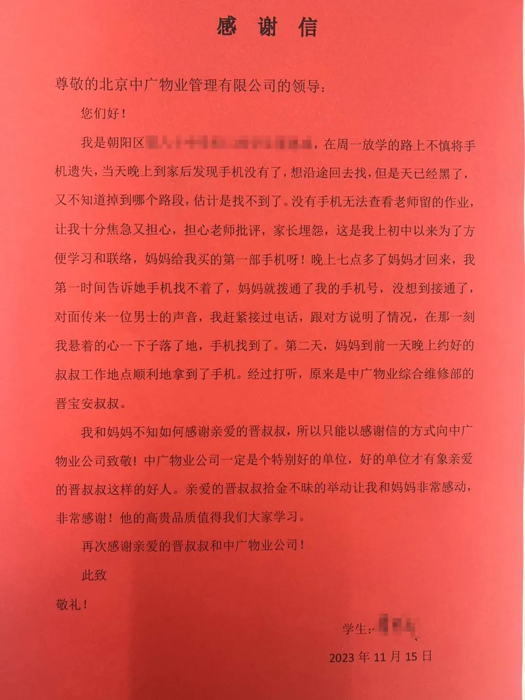 近日,北京中廣物業(yè)管理有限公司收到一封感謝信,表達(dá)對(duì)央視光華路項(xiàng)目部員工晉寶安拾金不昧歸還手機(jī)的感激之情。